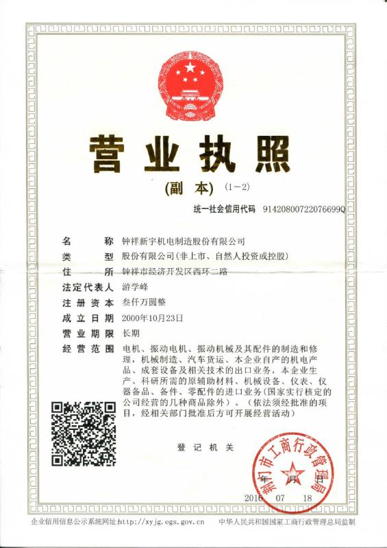 鐘祥新宇機電制造股份有限公司前身是鐘祥電機廠,創(chuàng)建于1968年,于2014年9月24日由“鐘祥新宇機電制造有限公司”變更名為“鐘祥新宇機電制造股份有限公司。主要生產(chǎn)各類振動電機、振動機械、輸送機械。是中國電器工業(yè)協(xié)會中小型電機分會理事單位、中國重型機械工業(yè)協(xié)會洗選設(shè)備專業(yè)委員會理事單位,是中國具備真實生產(chǎn)實力的振動電機生產(chǎn)廠家。